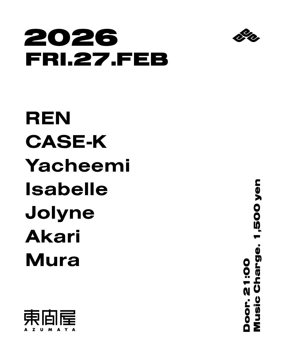 2026.02 27 FEB Azumaya -Friday- HIPHOP R&B HOUSE REGGAE FUNK 0 Shares Facebook Twitter google Line DATE: 2026-02-27 FRI OPEN: 21:00 VENUE: PRICE: Music Charge 1,500yen LINE UP: REN CASE-K Yacheemi Isabelle Jolyne Akari Mura