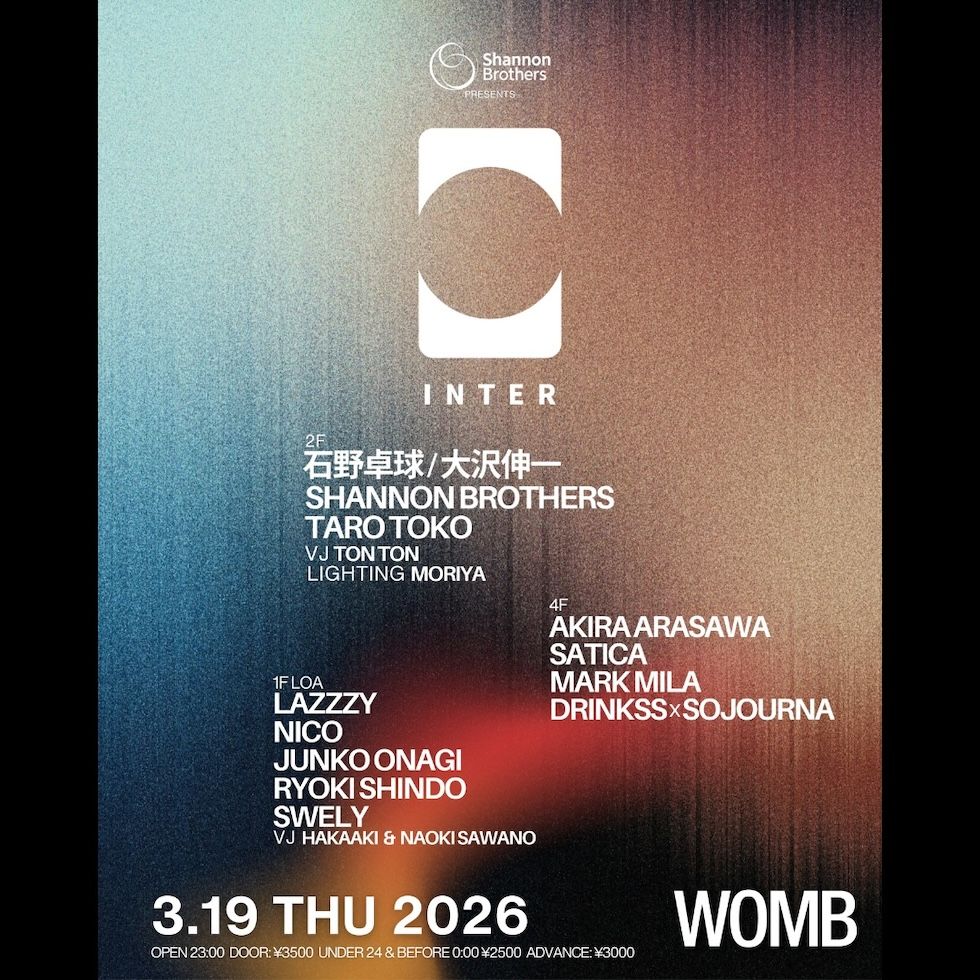 東京次世代テクノシーンを牽引する INTER が、3月19日 (祝日) WOMB にて開催される。ヘッドライナーには、電気グルーヴのメンバーであり、DJ/プロデューサーとして不動の地位を確立し、シーンのトップに君臨し続ける石野卓球と、 SHINICHI OSAWA / MONDO GROSSO / RHYME SO / DONGROSSO など多彩な名義で世界のトップアーティストへのリミックス&プロデュースし、常識を更新し続けるアーティスト大沢伸一が本パーティーに初登場。