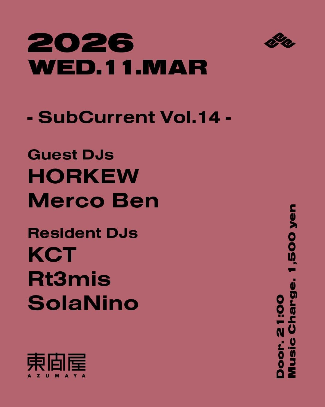 2026.03 11 MAR - SubCurrent Vol.14 - BASS MUSIC 0 Shares Facebook Twitter google Line DATE: 2026-03-11 WED OPEN: 21:00 VENUE: PRICE: Music Charge 1,500yen LINE UP: Guest DJs: HORKEW Merco Ben Resident DJs: KCT Rt3mis SolaNino