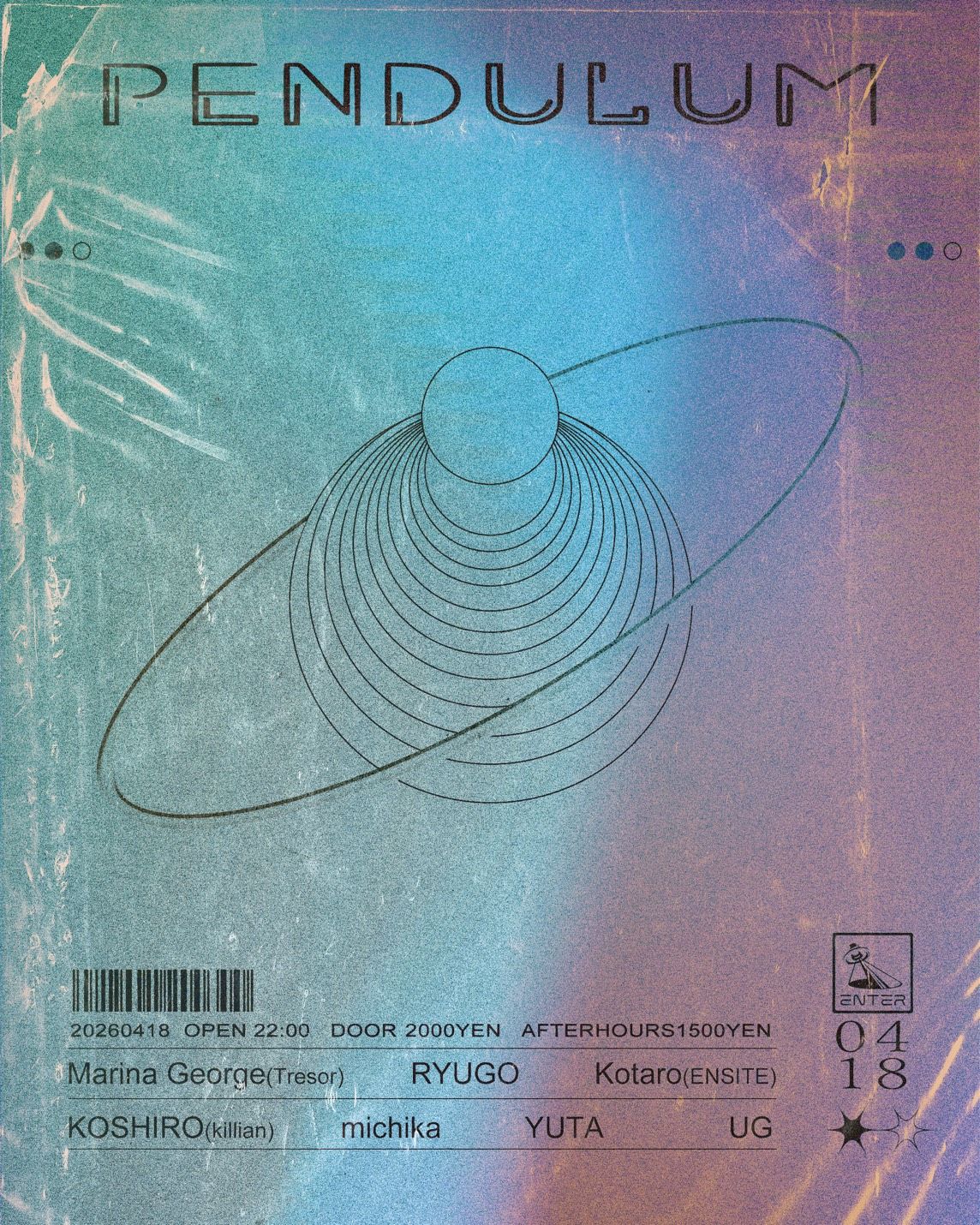 テクノシーンのさらなる拡張を目的に、先進気鋭のアプローチとキュレーションで国内最高峰のレーベルとなったサイケデリックテクノのオリジネーター〈Liquid Drop Groove〉主宰のYUTAと、ディープテクノパーティ松果体の主導者UGが始動したPendulum。7回目となる今回、ギリシャ出身で現在はベルリンを拠点に活動するMarina Georgeを招聘。