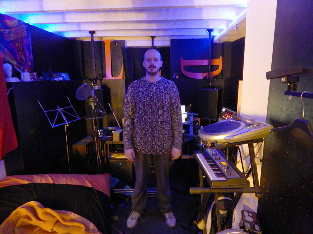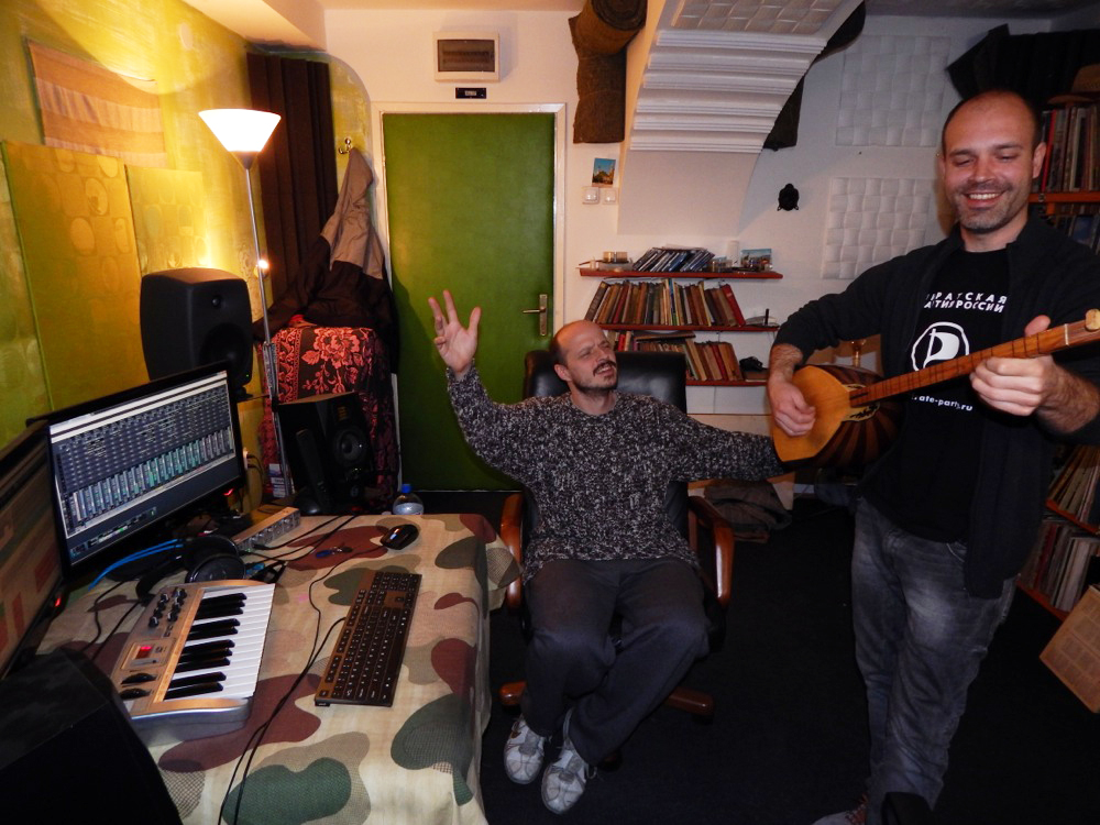 この日は彼の友人のミュージシャンMKDSL(動画左)がスタジオに来ていて、彼のトラックの仕上げ作業を共同で行っていた(MKDSLはセルビア語で"Majka Kaže Da Sam Lep"の略で、「ママは僕をハンサムだと言っている」という意味、これまた一風変わっている。)途中でアラブ風のトラックに合わせてバルカン半島・トルコ・中近東で広く使われる弦楽器サズを出してきて遊び始める。