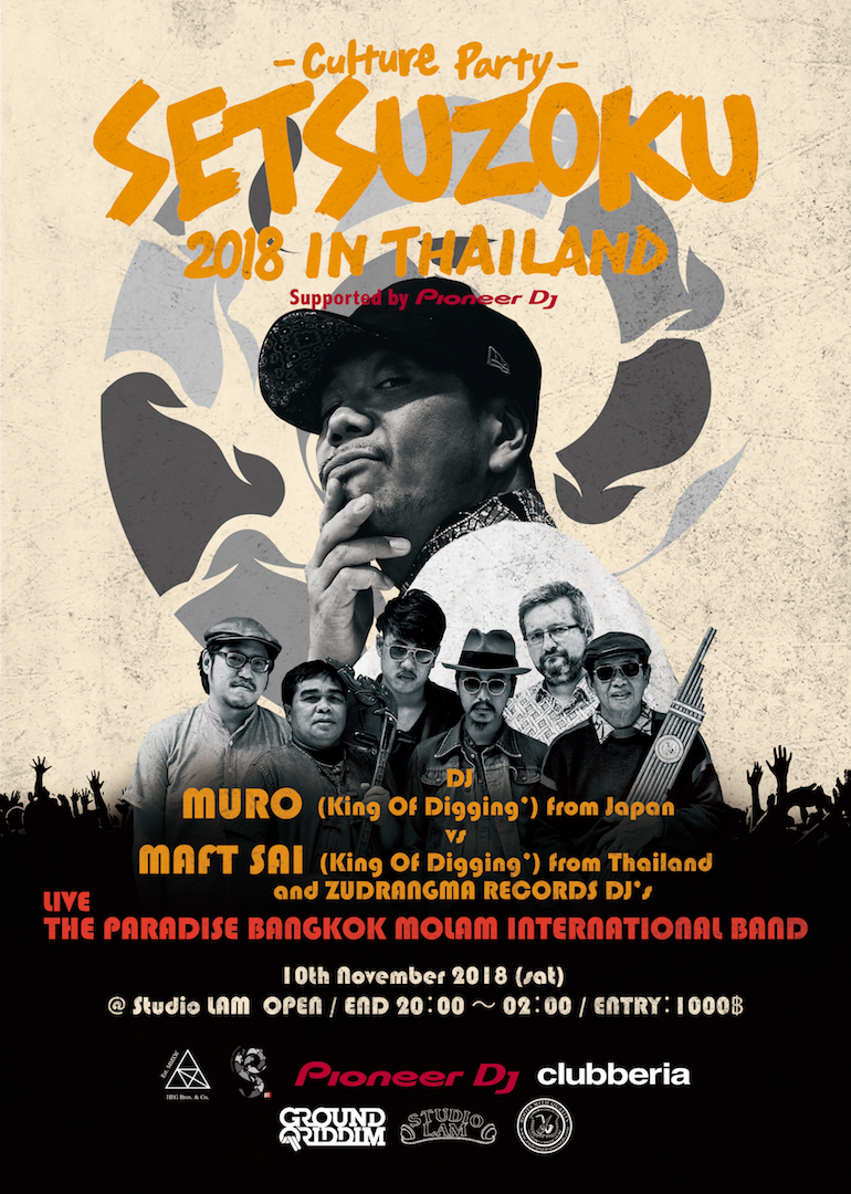 日本からキング・オブ・ディギンことMUROが出演。現地の出演者には、60年代から80年代初期の7インチとLPを収集し世界へ発信しているタイのキング・ オブ・ディギンことMAFT SAIが登場。日本とタイのディガー共演が実現する。そのほかにも、タイの伝統的な民族音楽ルクトゥンからタイ・ファンクなどを中心に揃えるレコードショップZudRangma RecordsのDJたちやタイの伝統音楽とレア・グルーヴやレゲエの感覚を融合したモダン・モーラム・ バンドThe Paradise Bangkok Molam International Bandが出演する。