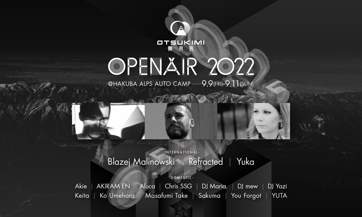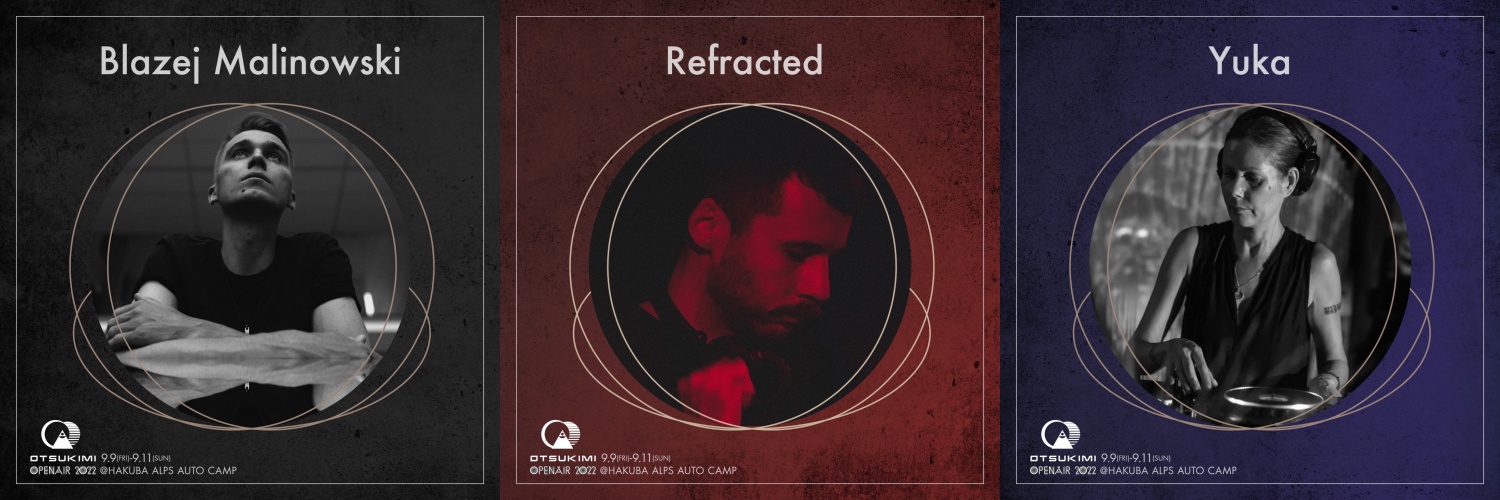 そんな新興テクノレイブ「御月民 -Otsukimi- 」の出演者には、総勢16組のアーティストがラインナップ。海外からは、レーベル「Inner Tension」主宰、アンビエントからテクノまで多彩な音色を操るBlazej Malinowski、「Pole Group」や「Semantica」といった人気レーベルからリリースを重ねる一方ベルリンの名門クラブTresorにてパーティメイクをするRefracted、Dasha Rushのレーベル「Fullpanda」のメンバーの一人として活躍するYukaの出演が決定。各アーティスト、世界中のパーティーからオファーの絶えない存在であり、今回の来日では、3組とも本レイブのみの限定公演となっている。