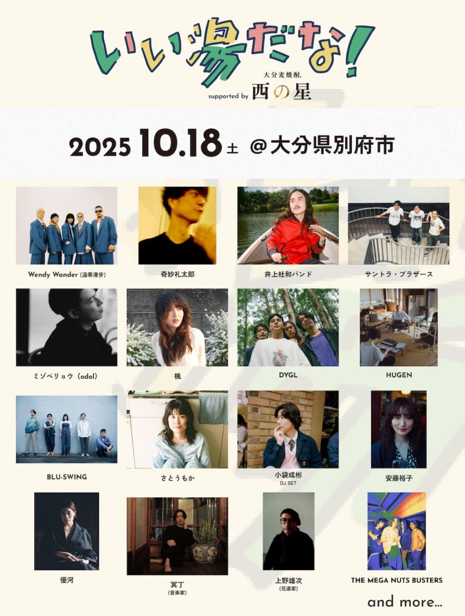 「いい湯だな!」2025は、温泉の街・別府の繁華街を回遊しながら、音楽ライブ、トークセッション、地元の飲食店、レコードマーケットなど、様々なコンテンツに溢れた音楽フェス。街全体をひとつのイベント会場として楽しむことができる温泉のように日常と非日常が混ざり溶け合うイベントとして展開される。