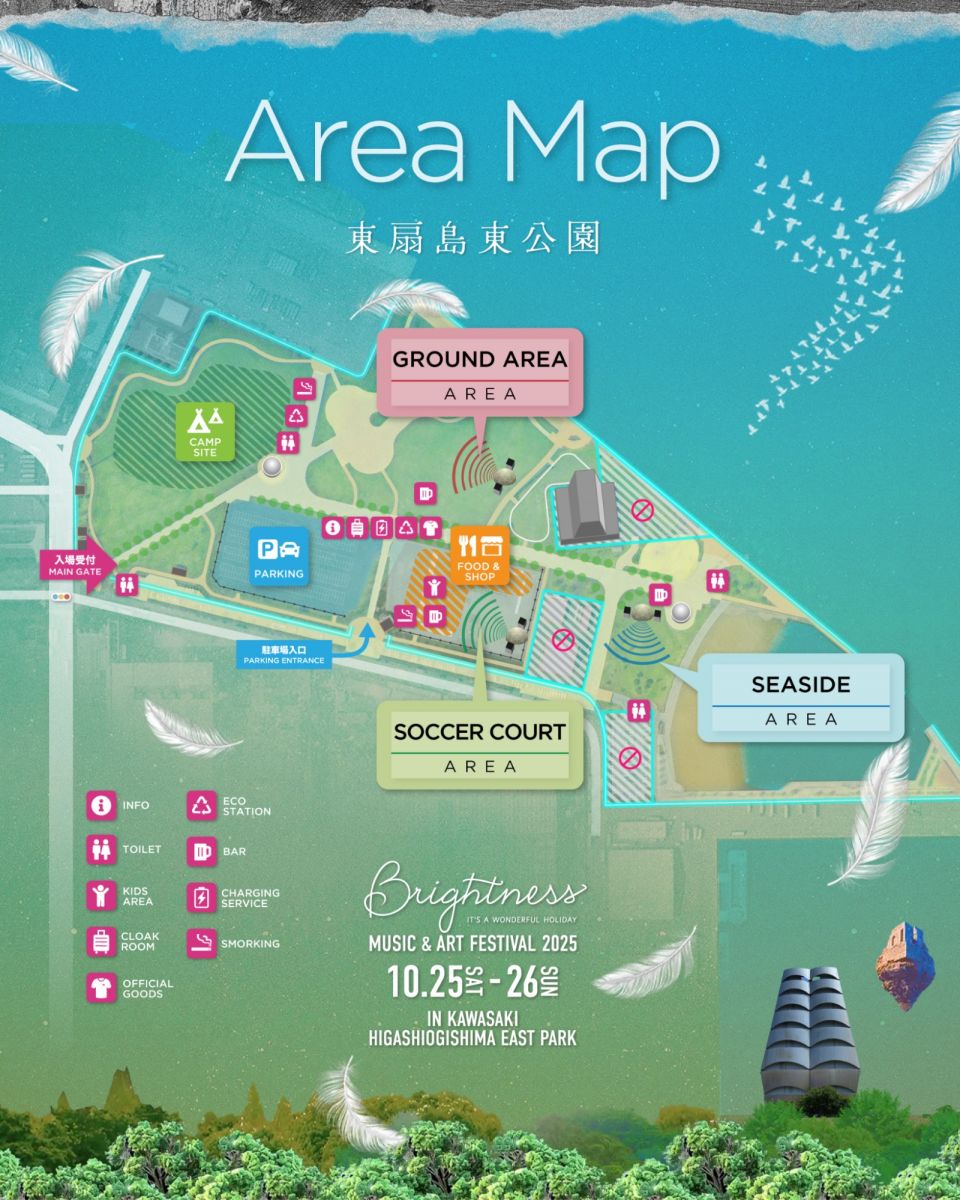 「Brightness Music & Art Festival 2025」の魅力は、音楽やアートだけでなく、“都心からわずか1時間圏内で体験できる開放感”にもある。会場の東扇島東公園は、川崎駅からバスやタクシーで約20分というアクセスの良さながら、海と夜景を望む広大なロケーションが広がり、都会の喧騒を離れて思い切り解放される時間を提供してくれる。さらに、会場には特設駐車場が設けられ、車での来場にも対応。周辺には早朝・深夜でも利用可能な銭湯もあり、フェスの合間にリフレッシュできるのも魅力だ。