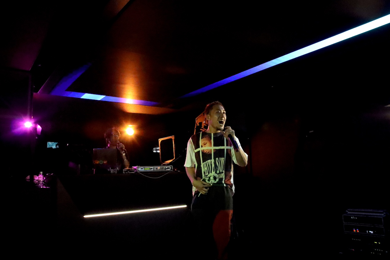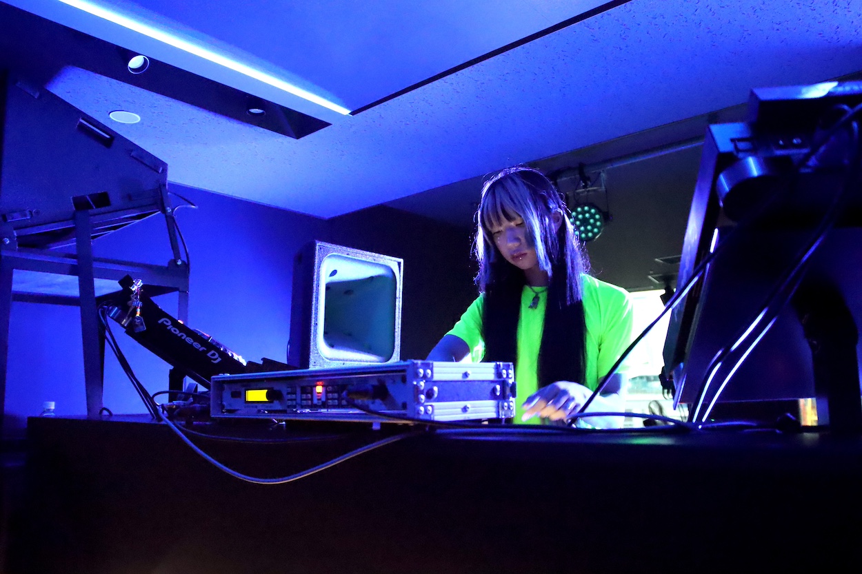 そして、今年「U/M/A/A」と契約を果たした、ノースカロライナ出身の新鋭アーティストKENTENSHI(ケンテンシ)が、彼にとって人生初というDJプレイに挑戦。この記事の後半で彼のインタビューを紹介するけれど、現在21歳の彼は、アップデートされ尽くした世の中の音楽環境の中で、楽曲制作を行う次世代を担う期待のアーティストだ。DJの前半は90年~2000年代を彷彿させるようなドラム&ベースをプレイし、KENTENSHIの名前を広めた「paranoia」……この曲は、「U/M/A/A」から2015年にリリースされた椎名もた「少女A」を無許可でリミックスし、それがYouTubeやTikTokなど、インターネット上で世界的に大ブレイクした、今のご時世ならではのヒット曲なのだけど、ブレイクコアとでも言うか、壊れたかけらが集結して突き進むようなグッと人の心を掴むような展開が素晴らしく、この曲がかかると一気にフロアに熱が入る。そこから5~6曲、最新のオリジナルの楽曲をプレイ。ネット世代が作るエレクトロニック・ミュージックと言えども、さすがに黒い。センスのあるサウンドを聴かせてくれた。