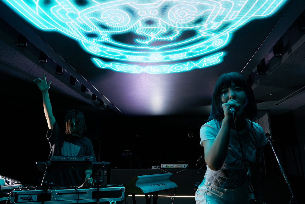 そして2組のバンドによるライヴが開始。 中国・上海&南京出身、現在は東京を拠点に活動をする、Lola One(ローラ・ワン)とCase One(ケース・ワン)から成るエレクトロニック・ポップデュオ、Wang One(ワン・ワン)。電子音とギターが交差するヘヴィでポップ感のあるアグレッシヴなサウンドに、Lola Oneのエモーショナルなヴォーカルがとてもいい。 「Oh Young Boy」、「Dragon Blood」、そして80年代のテクノミュージックをオマージュした人気曲「(I don’t give a)Crap」などをプレイしてくれた。