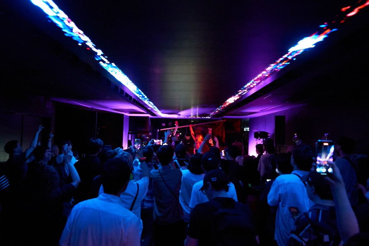 この時間、もうひとつのフロアではYUKI KAWAMURAがDJプレイ。その他、Hideo Kobayashi、Jay Zimmermannなどがこの日、DJプレイを行った。またVJは「U/M/A/A」と長い付き合いのある映像チーム100LDKが担当。線路沿いに位置するZERO-SITE高輪ゲートウェイは縦に長い空間で、天井に映し出されたミニマルな映像は圧巻であった。