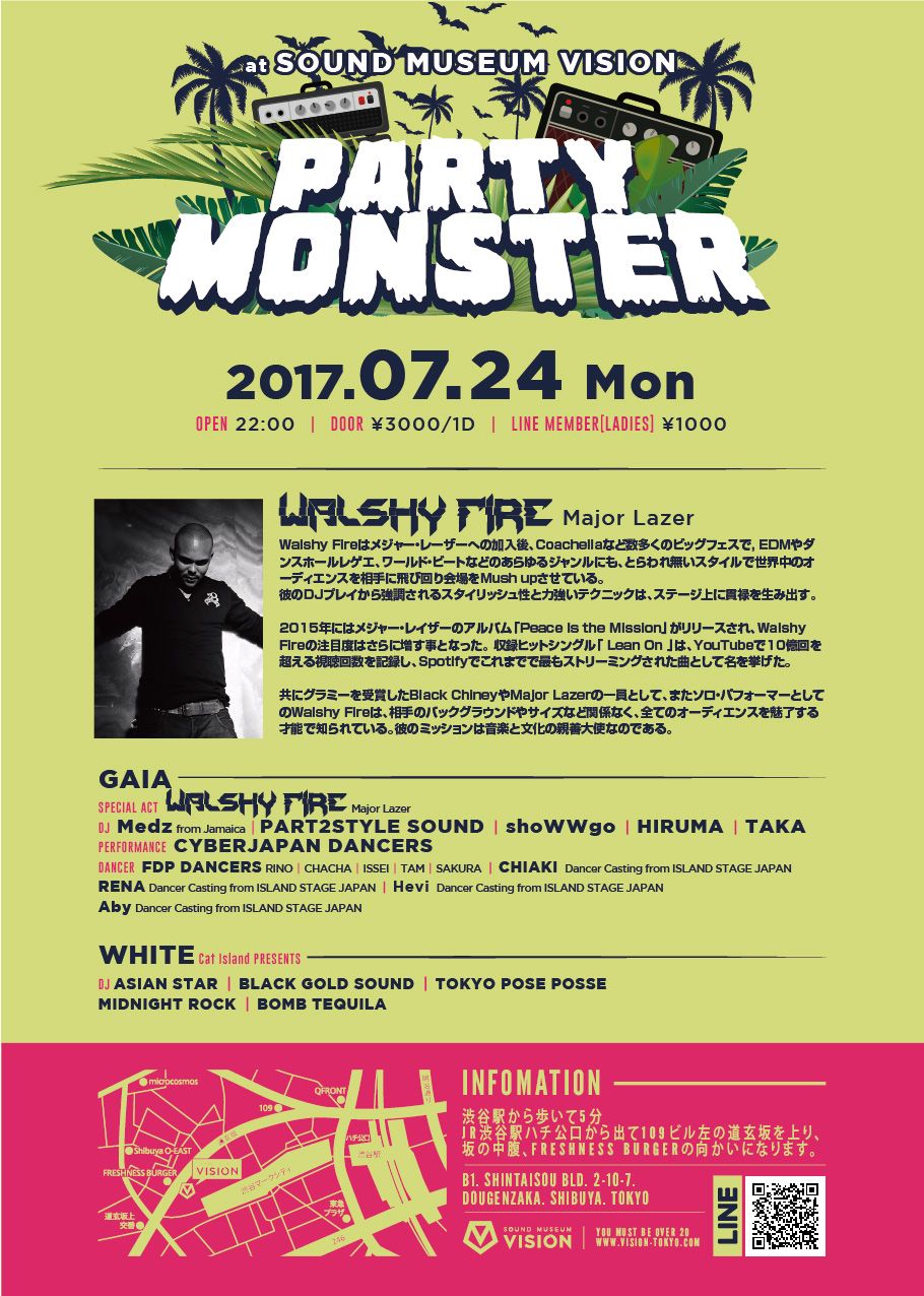 週末だけでは遊び足りないパーティーピープルにたちで賑わうPARTY MONSTER!! VISION MONDAYの中でもそのエネルギーは1番であろう。 そんなPARTY MONSTERに世界的に有名なあのMAJOR LAZERからWalshy Fireを招聘しての開催だ。 週末以上の盛り上がり、渋谷で1番の盛り上がりをぜひ体感してほしい!