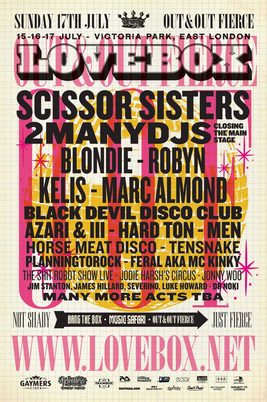 - Scissor Sisters, 2ManyDJs, Blondie, Beth Ditto, Bowski, Severino, Robyn, Kris Di Angelis - Live, Kelis, Marc Almond, Black Devil Disco Club, Azari & III, Filthy Dukes, Hard Ton, Men, May 68, Monarchy, Retro/Grade, Horse Meat Disco, Tensnake, Scottee, Planningtorock, This Is...Circus, Feral AKA MC Kinky, The Shit Robot Show Live, Jodie Harsh's Circus, Jonny Woo, Jim Stanton, Trailer Trash, Viktoria Modesta, James Hillard, Style of Eye, Hot Boy Dancing Spot, Severino, Luke Howard, Tom Stephan, Dr Noki, Fred Falke, Warboy, 【VIP Area】Dirtbox, Disco Bloodbath, [Promoter] Lovebox