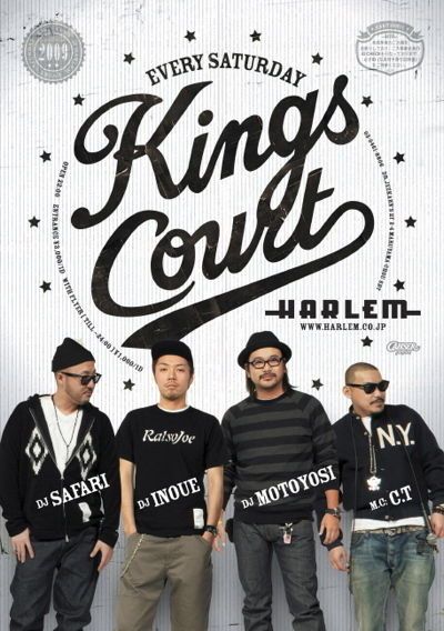 渋谷・円山町から世界の果てまで震撼させるTOKYO NO.1 SATURDAY NIGHT PARTY "Kings Court"。星の数ほどの伝説の夜を残してきたDJ SAFARI、DJ INOUE、DJ MOTOYOSIの日本代表 3 DJsと、10年間HARLEM唯一のレギュラーMCとして走り続けてきたC.Tの、東京が誇る無敵の四天王の夢の競演!黄金の風が吹き荒れる華々しいフロアは、時に荒く、時に優しく、時に切なく、いつでも美しい。まさしく「江戸のHIP HOPの絶景」である。歴代、数々の伝説PARTYが名を連ねてきたHARLEMの伝説の土曜の夜。"Kings Court"は2011年、新章に突入する!