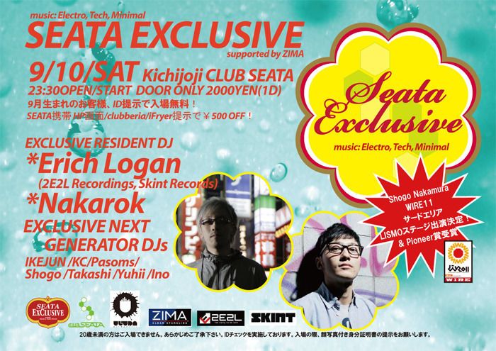 スタイリッシュな空間と大箱クラスに位置づけされる最大500人収容のメインフロア、そしてミニマル、テック、エレクトロ等、常に先鋭的なエレクトロニックダンスミュージックを存分に楽しめるパーティー、「SEATA EXCLUSIVE」。今回は、Fatboy Slim主宰でヨーロッパ屈指のダンスミュージックレーベル「Skint Records」からデビューを果たし、Deadmau5などが属するアメリカの巨大レーベル「Ultra Music」にも楽曲がライセンスされ、「2E2L Recordings」からリリースを続けるErich Logan。テッキー&エレクトロな時流のサウンドが持ち味のNAKAROKをはじめ、東京のリアルなクラブシーンで活躍する様々なDJ達が出演。 なお、日本最大級屋内テクノレイヴ「WIRE」にShogo Nakamuraの出演が決定しました!「WIRE11」オフィシャルサイトでの一般投票及び選考委員会による最終審査を経て、サードエリア LISMOステージ出演とPioneer賞を堂々獲得! 2010/10/9の一周年パーティー当日にはなんと世界最大のダンスミュージック販売サイト「Beatport」より2E2L Recordingsから「SEATA EXCLUSIVE EP」をリリース。レジデント陣による会心の4作品。すでに関東や関西のDJにレコメンドやプレイもされている楽曲達をパーティー今月も世界へ発信! パーティー2年目を迎え、ますます加速し続けるSEATA EXCLUSIVEに是非お越しください。