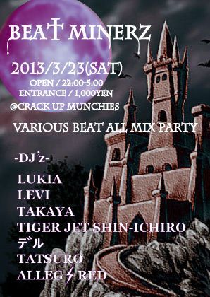 2013.03 23 MAR BEAT MINERZ ELECTRONICA TRANCE TECHNO HOUSE 0 Shares Facebook Twitter google Line DATE: 2013-03-23 SAT OPEN: 22:00 VENUE: PRICE: ¥1000 LINE UP: LEVI TAKAYA TIGER JET SHIN-ICHIRO デル TATSURO ALLEG-RED LUKIA