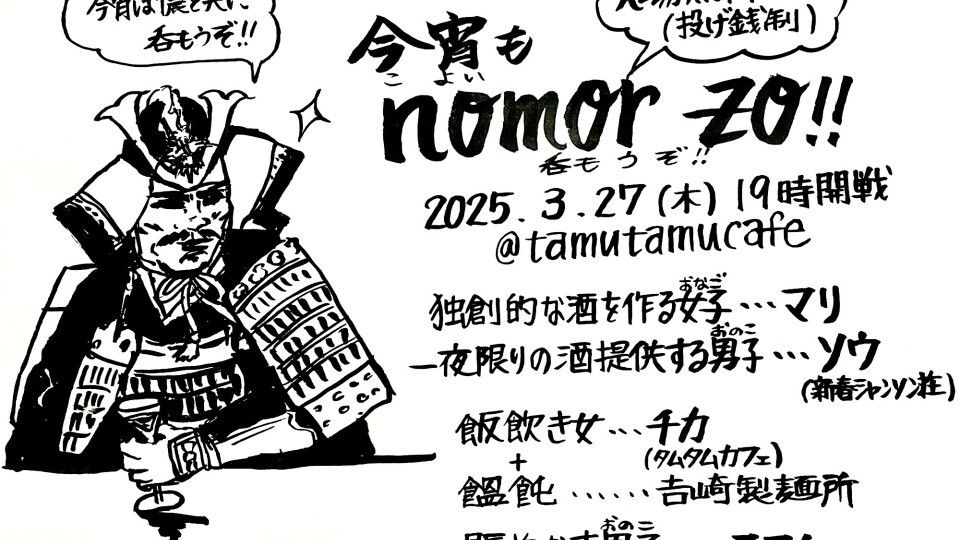 ひょうきんが服を着て歩く姉さんこと流離のバーテンダーまりちゃんと、年末に惜しまれつつ閉店した味園ビル2Fの癒しの酒場新春シャンソン荘の主そうくんをタムタムカフェに召喚!バーカンにはそうくんが…オリジナルカクテルはまりちゃんが…BGMにはみんなのどんちゃん!フードは岡山のそうくんの実家である吉崎製麺所のうどんをスタンバイ!それだけでもう呑める、いや呑もうぞ!今宵もnomor zo!!