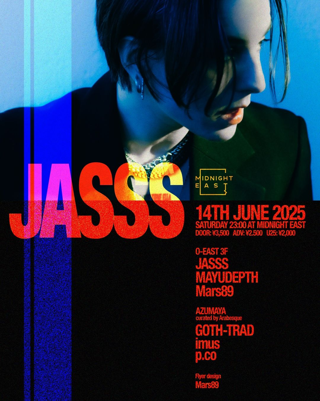 5年ぶりの来日となる今回、O-EAST 3FでJASSSと共演するのは、人気クィアナイトMOTORPOOLのレジデントを経て、現在エレクトロニックミュージックパーティーVITALの共同主催者であるMAYUDEPTH。昨年80年代のインダストリアル、ニューウェーヴの姿勢にインスパイアされた自身のレーベルNocturnal Technologyを立ち上げたMars89の2人だ。