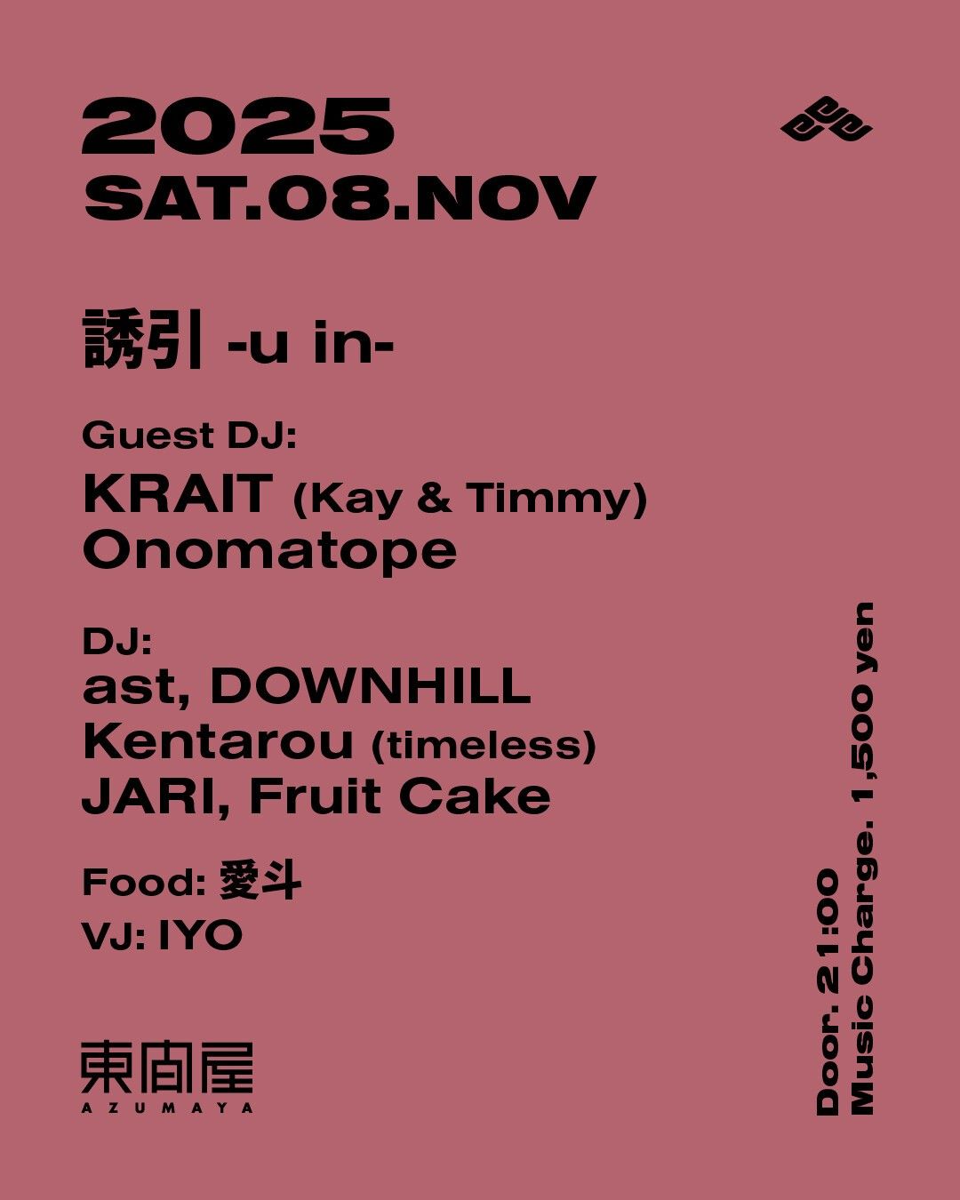 2025.11 08 NOV 誘引 -u in- BASS MUSIC HIPHOP HOUSE 0 Shares Facebook Twitter google Line DATE: 2025-11-08 SAT OPEN: 21:00 VENUE: PRICE: Music Charge 1,500yen LINE UP: Guest DJ: KRAIT (Kay & Timmy) Onomatope DJ: ast DOWNHILL Kentarou (timeless) JARI Fruit Cake Food: 愛斗 VJ: IYO