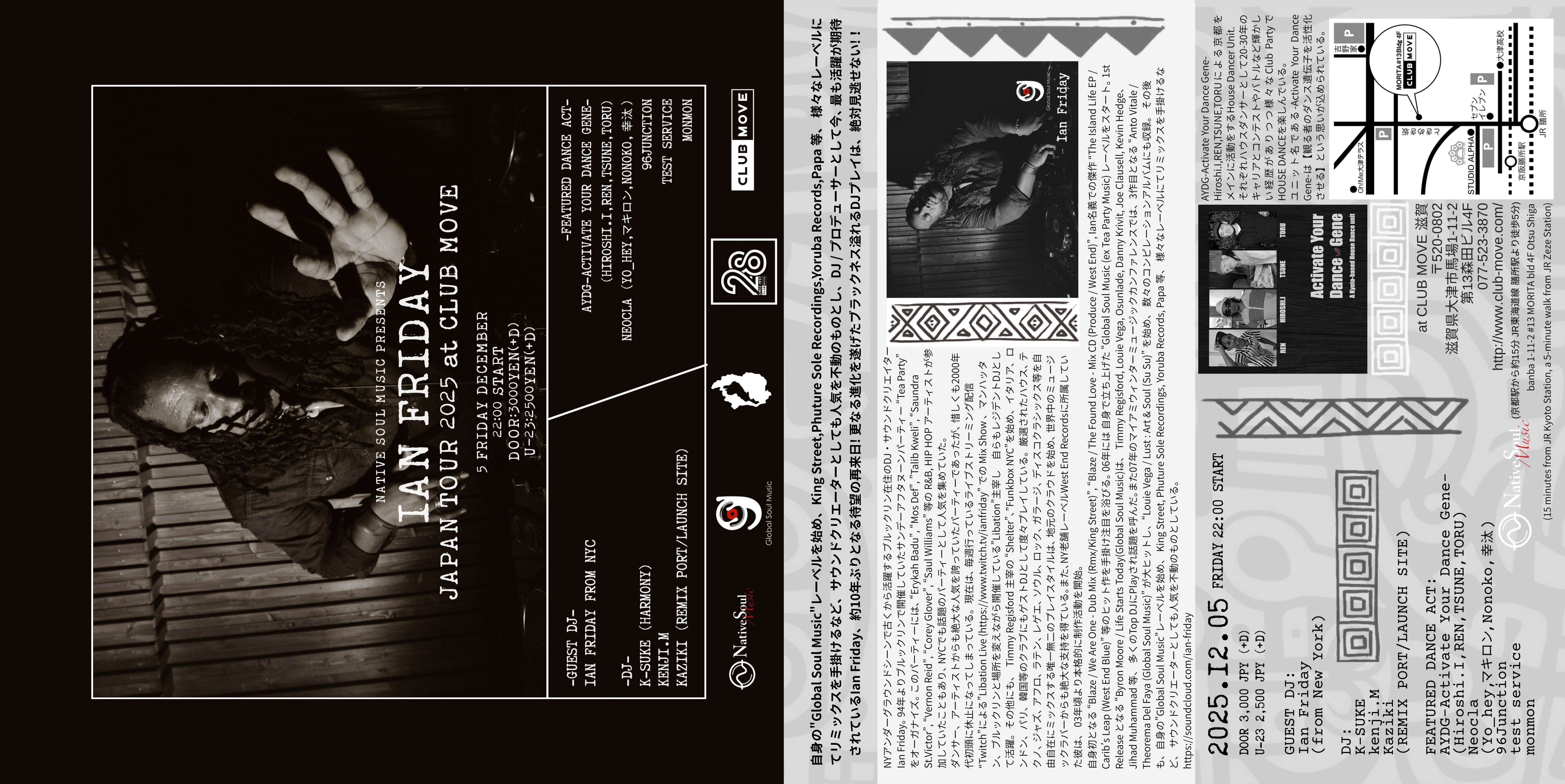 NYアンダーグラウンドシーンで古くから活躍するブルックリン在住のDJ・サウンドクリエイター Ian Friday。 94年よりブルックリンで開催していたサンデーアフタヌーンパーティー “Tea Party” をオーガナイズ。 このパーティーには、 “Erykah Badu”, “Mos Def”, ”Talib Kweli”, “Saundra St.Victor”, “Vernon Reid”, “Corey Glover”, “Saul Williams” 等の R&B, HIP HOP アーティストが参加していたこともあり、 NYCでも話題のパーティーとして人気を集めていた。 ダンサー、アーティストからも絶大な人気を誇っていたパーティーであったが、 惜しくも2000年代初頭に休止になってしまっている。現在は、 毎週行っているライブストリーミング配信 “Twitch”による”Libation Live (https://www.twitch.tv/ianfriday” での Mix Show 、マンハッタン、ブルックリンと場所を変えながら開催している”Libation”主宰し 自らもレジデントDJとして活躍。その他にも、 Timmy Regisford 主宰の “Shelter”、”Funkbox NYC”を始め、イタリア、ロンドン、パリ、韓国等のクラブにもゲストDJとして度々プレイしている。厳選されたハウス、 テクノ、 ジャズ、 アフロ、 ラテン、 レゲエ、 ソウル、 ロック、 ガラージ、 ディスコクラシックス等を自由自在にミックスする唯一無二のプレイスタイルは、 地元のクラウドを始め、 世界中のミュージックラバーからも絶大な支持を得ている。また、NY老舗レーベルWest End Recordsに所属していた彼は、 03年頃より本格的に制作活動を開始。 自身初となる “Blaze / We Are One - Dub Mix (Rmx/King Street)”, “Blaze / The Found Love - Mix CD (Produce / West End)”, Ian名義での傑作 “The Island Life EP / Carib’s Leap (West End Blue)” 等のヒット作を手掛け注目を浴びる。 06年には 自身で立ち上げた “Global Soul Music (ex Tea Party Music) レーベルをスタート。 1st Release となる “Byron Moore / Life Starts Today(Global Soul Music)は、 Timmy Regisford, Louie Vega, Osunlade, Danny Krivit, Joe Clausell, Kevin Hedge、Jihad Muhammad 等、 多くのTop DJにPlayされ話題を呼んだ。また07年のマイアミウィンターミュージックカンファレンスでは、3作目となる “Anto Vitale / Theorema Del Faya (Global Soul Music)” が大ヒットし、“Louie Vega / Lust : Art & Soul (Su Su)” を始め、 数々のコンピレーションアルバムにも収録。 その後も、自身の”Global Soul Music”レーベルを始め、 King Street, Phuture Sole Recordings, Yoruba Records, Papa 等、 様々なレーベルにてリミックスを手掛けるなど、 サウンドクリエーターとしても人気を不動のものとしている。