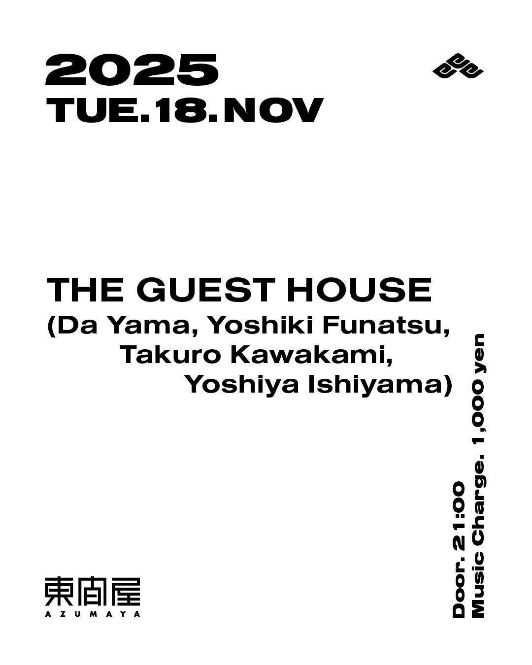2025.11 18 NOV Azumaya -Tuesday- HOUSE TECHNO 0 Shares Facebook Twitter google Line DATE: 2025-11-18 TUE OPEN: 21:00 VENUE: PRICE: Music Charge 1,000yen LINE UP: THE GUEST HOUSE (Da Yama, Yoshiki Funatsu, Takuro Kawakami, Yoshiya Ishiyama)
