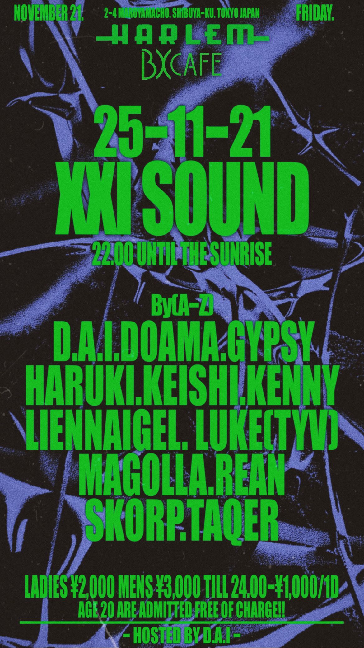 - LADIES ¥2,000 MEN ¥3,000 ※ till 24:00 ¥1,000/1d ※ AGE 20 ARE ADMITTED FREE OF CHARGE!!