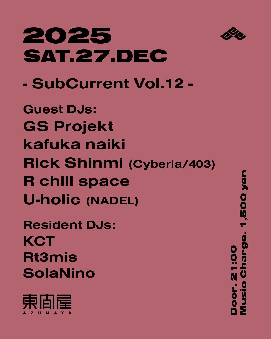 2025.12 27 DEC - SubCurrent Vol.12 - BASS MUSIC 0 Shares Facebook Twitter google Line DATE: 2025-12-27 SAT OPEN: 21:00 VENUE: PRICE: Music Charge 1,500yen LINE UP: Guest DJs: GS Projekt kafuka naiki Rick Shinmi (Cyberia/403) R chill space U-holic (NADEL) Resident DJs: KCT Rt3mis SolaNino
