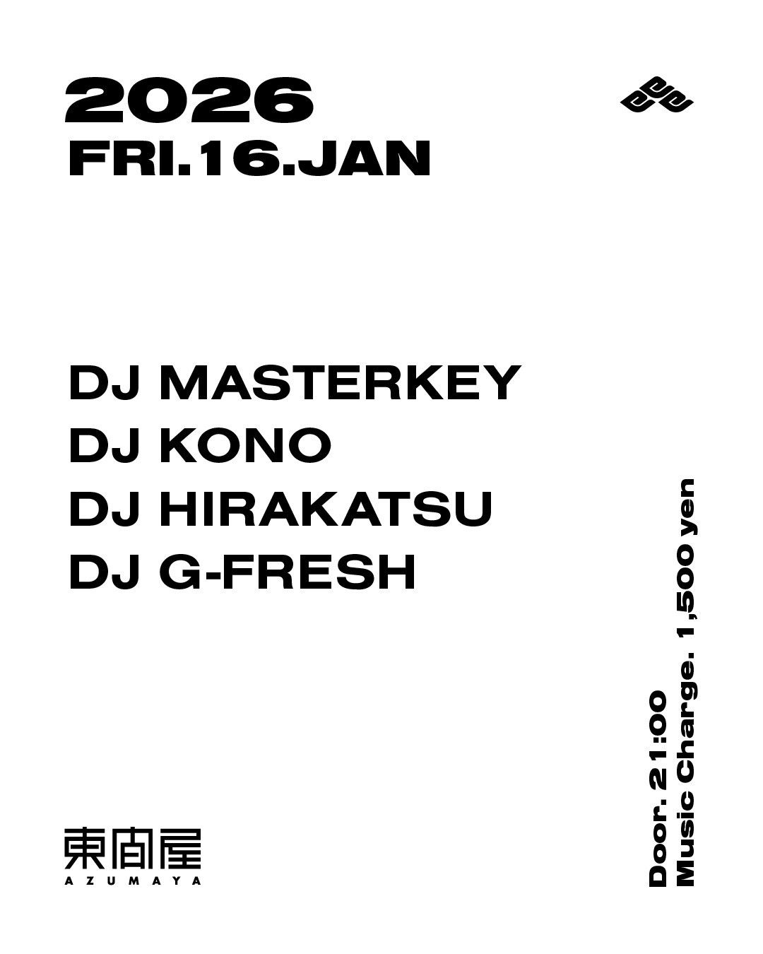 2026.01 16 JAN Azumaya -Friday- HIPHOP 0 Shares Facebook Twitter google Line DATE: 2026-01-16 FRI OPEN: 21:00 VENUE: PRICE: Music Charge 1,500yen LINE UP: DJ MASTERKEY DJ KONO DJ HIRAKATSU DJ G-FRESH
