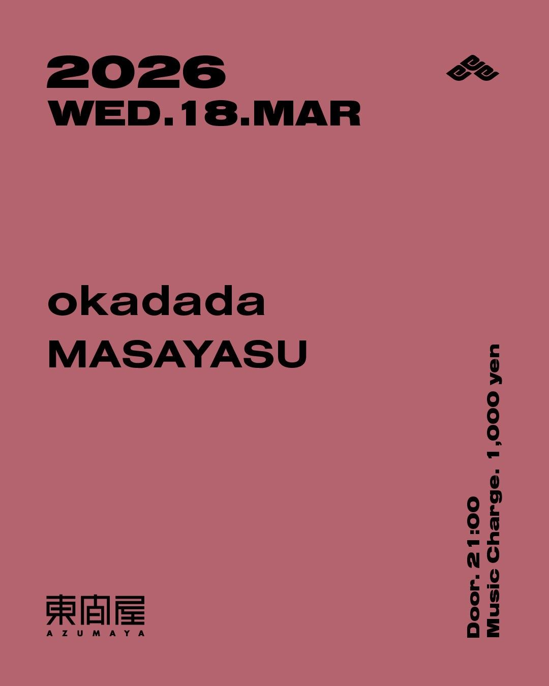 2026.03 18 MAR Azumaya -Wednesday- HOUSE 0 Shares Facebook Twitter google Line DATE: 2026-03-18 WED OPEN: 21:00 VENUE: PRICE: Music Charge 2,000yen + 1 drink charge LINE UP: okadada MASAYASU