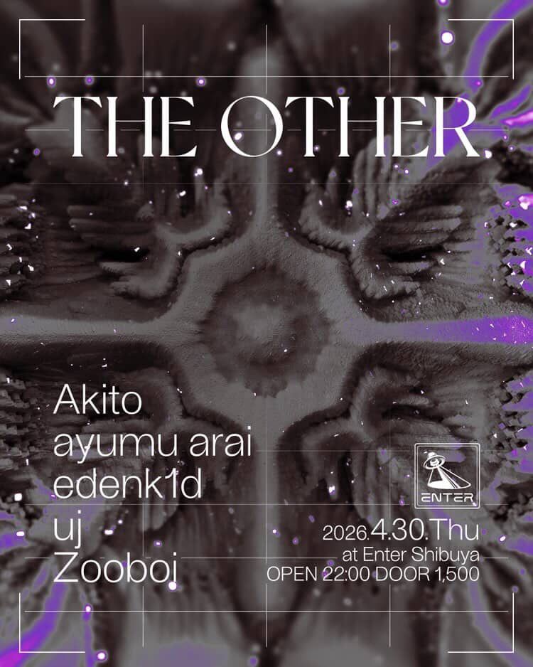 2012年に開始したSOME TRIPを皮切りに、C.R.A.C.K、DATURAを主催してきたujがコロナ禍に始動したTHE OTHER。ENTER初出演のedenk1d、Zooboiを交えた名古屋を拠点に活動する同朋、そして東京を拠点に活動するayumu araiを招きENTER SHIBUYAにて3度目の開催。