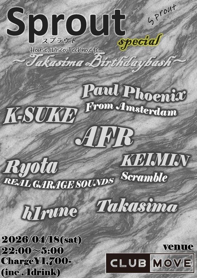 sprout is an event centered on four-on-the-floor beats, organized by Takashima in Kyoto, that promotes the budding and growth of new DJs who play various genres such as techno, house, hardcore, and Showa-era pop songs. Please feel free to use it as a place to meet friends who can stimulate each other's growth and discover new talent. This time, it's Takashima's birthday special! Welcoming 'Paul Phoenix' from the Netherlands, it looks like it will be a more disco-filled night than usual!!