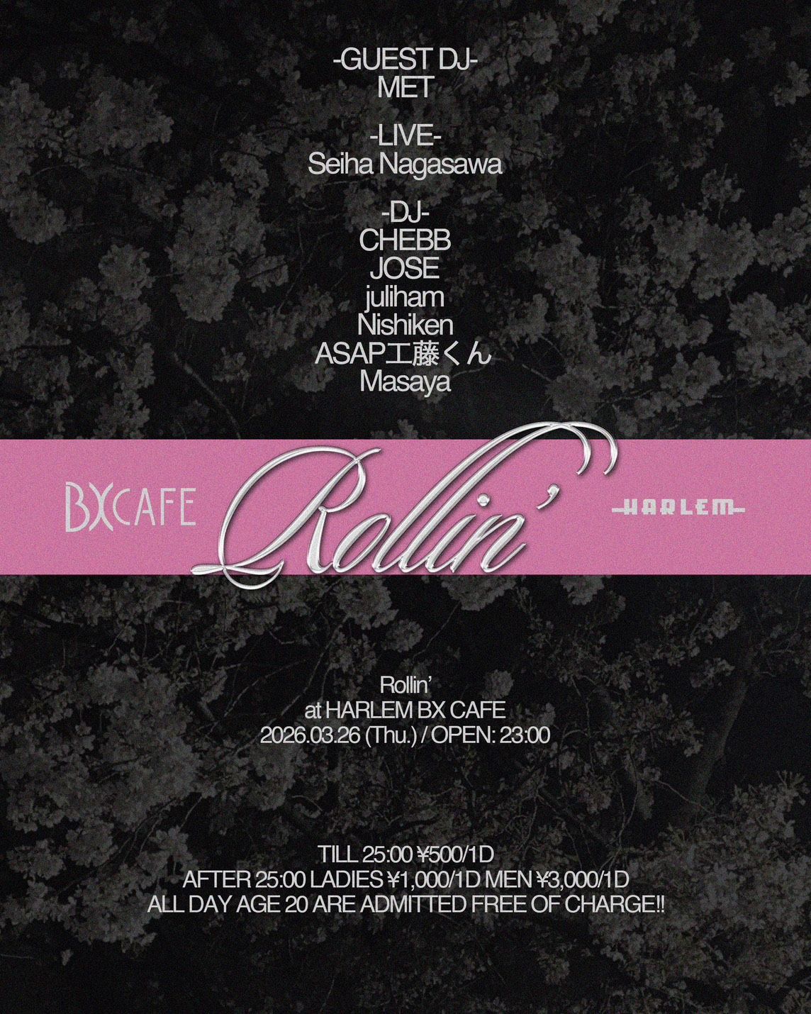 - LADIES ¥1,000/1d MEN ¥3,000/1d ※ TILL 25:00 ¥500/1d ※ AGE 20 ARE ADMITTED FREE OF CHARGE ALL DAY!!