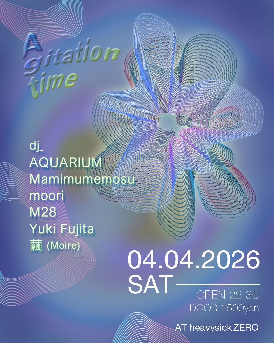 2026.04 04 APR Agitation time HOUSE TECHNO CROSSOVER 0 Shares Facebook Twitter google Line DATE: 2026-04-04 SAT OPEN: 22:30 VENUE: PRICE: [DOOR]1,500YEN LINE UP: ■DJ Aquarium a.k.a 外神田deepspace Mamimumemosu moori M28 Yuki Fujita 繭 (Moire) https://www.instagram.com/heavysickzero/