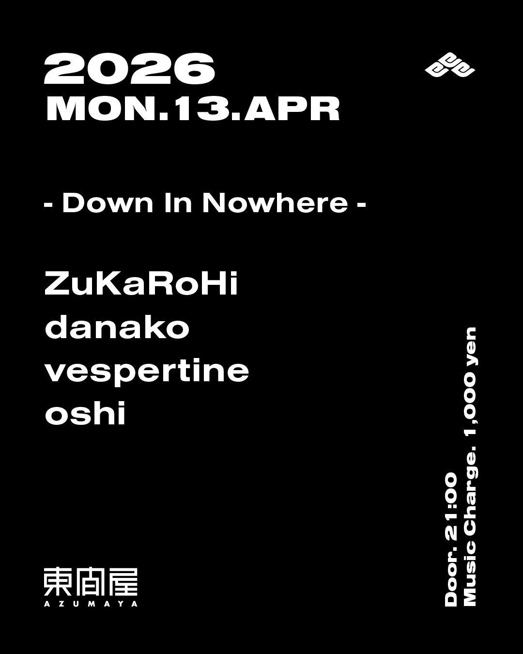2026.04 13 APR Down In Nowhere BASS MUSIC TECHNO 0 Shares Facebook Twitter google Line DATE: 2026-04-13 MON OPEN: 21:00 VENUE: PRICE: Music Charge 1,000yen LINE UP: ZuKaRoHi danako vespertine oshi