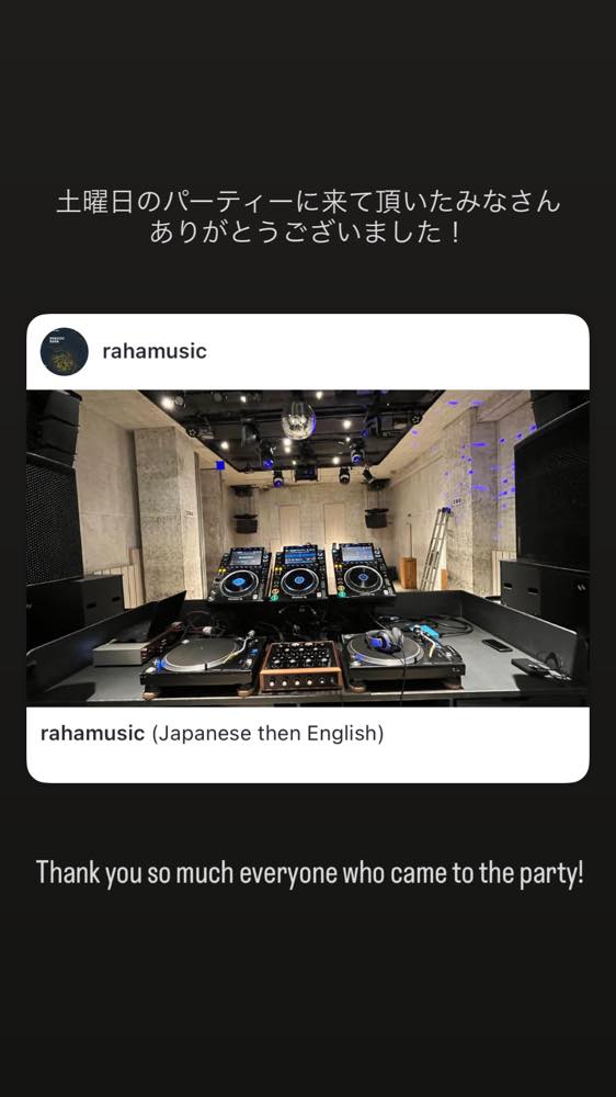 一晩通して、Lighting AiBAの照明はマジですごいと今更ながら思った。バッチリ。彼の照明が僕のDJの良いところを際立たせてくれているのを回していて実感した。パーティーの最後、エンディングの客電の上げ方を店側と協議。最後の10分をAiBAに少しずつ明るくしてってとリクエストしてたのもあり、音止まったら店側では電気何も触らないでくれると、AiBAにしばし上げるのも任せると言ってくれ、実際その通り彼が素晴らしい夢からの覚め方を見せてくれた。Rhadooも回し終わってそれ見てて絶賛。トッププロの業だった。心からのrespectを。