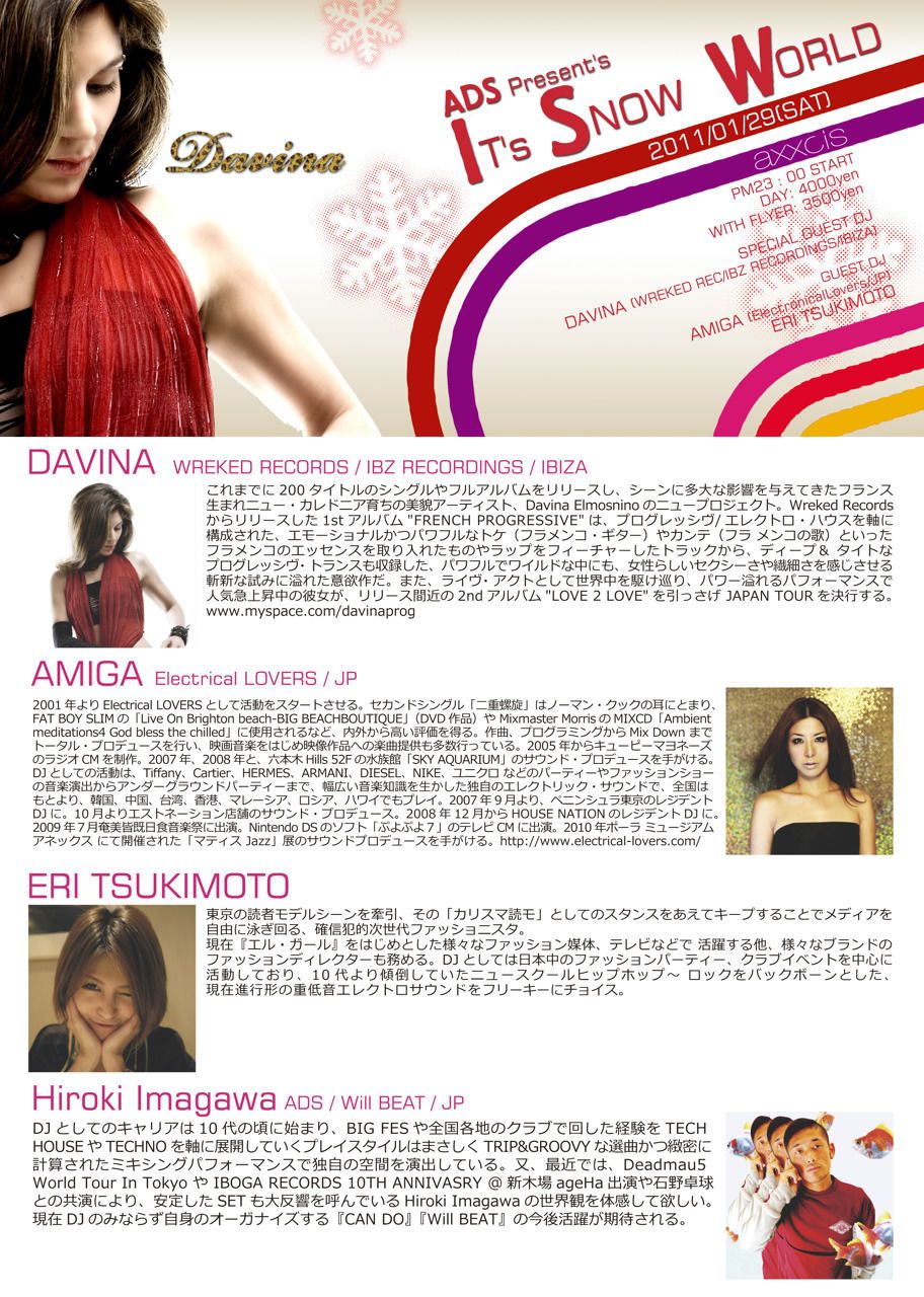 2011年1発目のADSは01/29(土)@渋谷Club axxcis2.3.4Fにて、PROGRESSIVE HOUSE.TECH HOUSE.ELECTRO HOUSE.PSY TRANCEを各階で楽しめる【IT's SNOW WORLD】を開催致します!!2FのSPECIAL GUESTはIBIZAから、 女性アーティストDAVINAがADS初登場!!GUESTは、HOUSE NATIONで活躍中のAMIGA、カリスマ読者モデル&DJとして大活躍のERI TSUKIMOTOのGIRLS DJがFLOORをROCKします。3FはPSYCHEDELIC LOVER PRESENTS RebeL mixed by YAGIのRELEASE PARTY!!ADSのDJ YAGIを中心に、I.P.U、Double FuckersやREIが熱くします。4Fは、TV, RADIO, 雑誌等様々なメディアやCLUBで活躍するGIRLS DJ達による、GIRLS ELECTRO VIP LOUNGE FLOOR!!ADS STAFF一同皆様のお越しを心よりお待ちしてます。