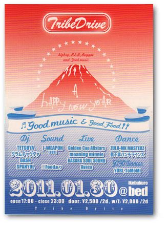 2011.01 30 SUN Tribe Drive クーポン HIPHOP ログインしてクーポンをゲット Facebook Twitter DATE: 2011-01-30 SUN OPEN: 17:00 VENUE: BED PRICE: ¥2500 LINE UP: [DJ] TETSUYA, クラムチャウダァ, DASH, SPANYOL, [SOUND] J-WEAPON (BSS), [LIVE] Golden Cap Allstars, moaning minnie, BASARA SOUL SOUND, Ayaca, [DANCER] ZULU-MK MASTERZ, 親不孝パンチラインズ, [GO GO DANCE] YURI, ToMoMi ※Foodあり Facebook Twitter