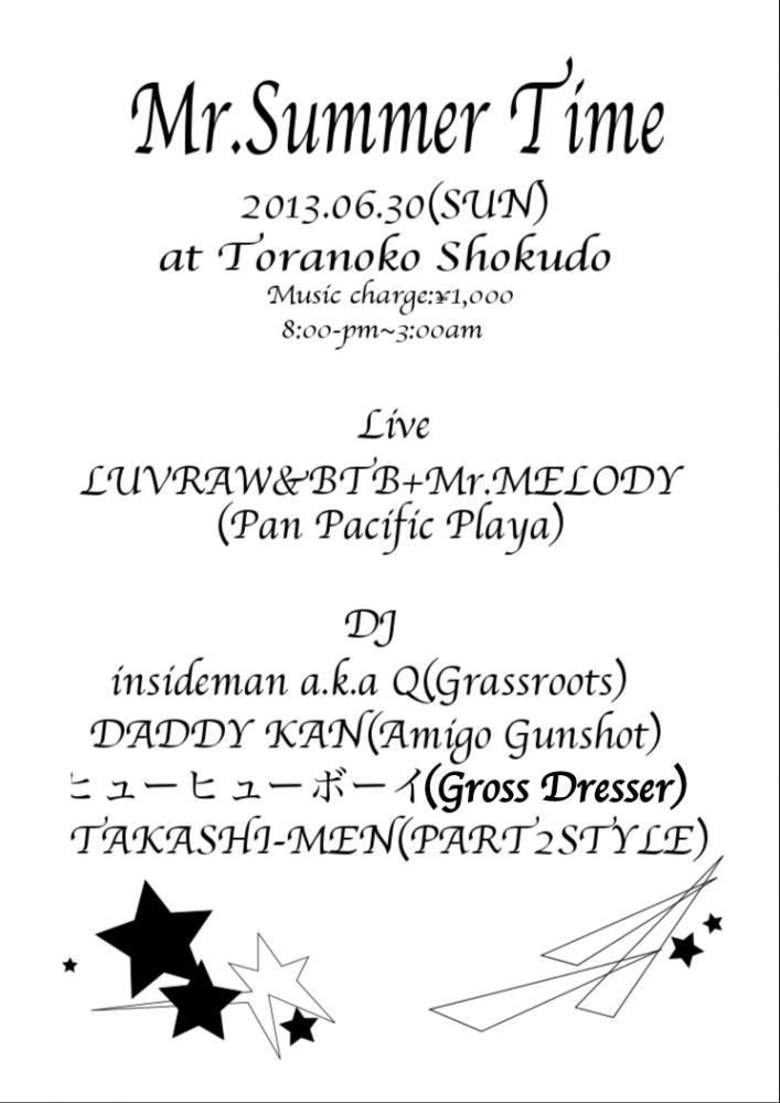 2013.06 30 SUN ミスターサマータイム REGGAE R&B SOUL ALLMIX Facebook Twitter DATE: 2013-06-30 SUN OPEN: 20:00 VENUE: 虎子食堂 PRICE: ¥1000 LINE UP: 【Live】 LUVRAW & BTB + Mr.MELODY (Pan Pacific Playa) 【DJ】 insideman a.k.a Q (Grassroots) DADDY KAN (Amigo Gunshot) MaL (PART2STYLE) ヒューヒューボーイ (Gross Dresser) TAKASHI-MEN (PART2STYLE) 去年の夏の終わり、平日にも関わらず大盛況となったミスターサマータイム! 今年は同じメンツで夏初め! Facebook Twitter
