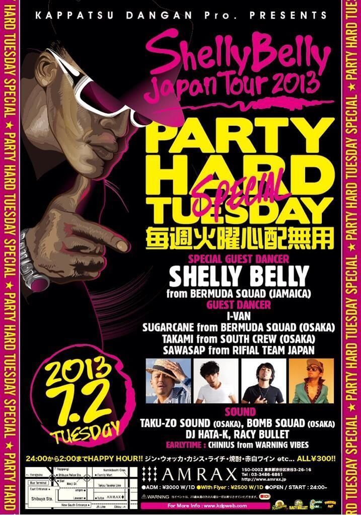 数多くのREGGAE DANCEを創作し人気を博すSHELLY BELLYがPARTY HARD TUESDAYに登場!!心配無用且つ最強の一夜になる事間違いナシ。