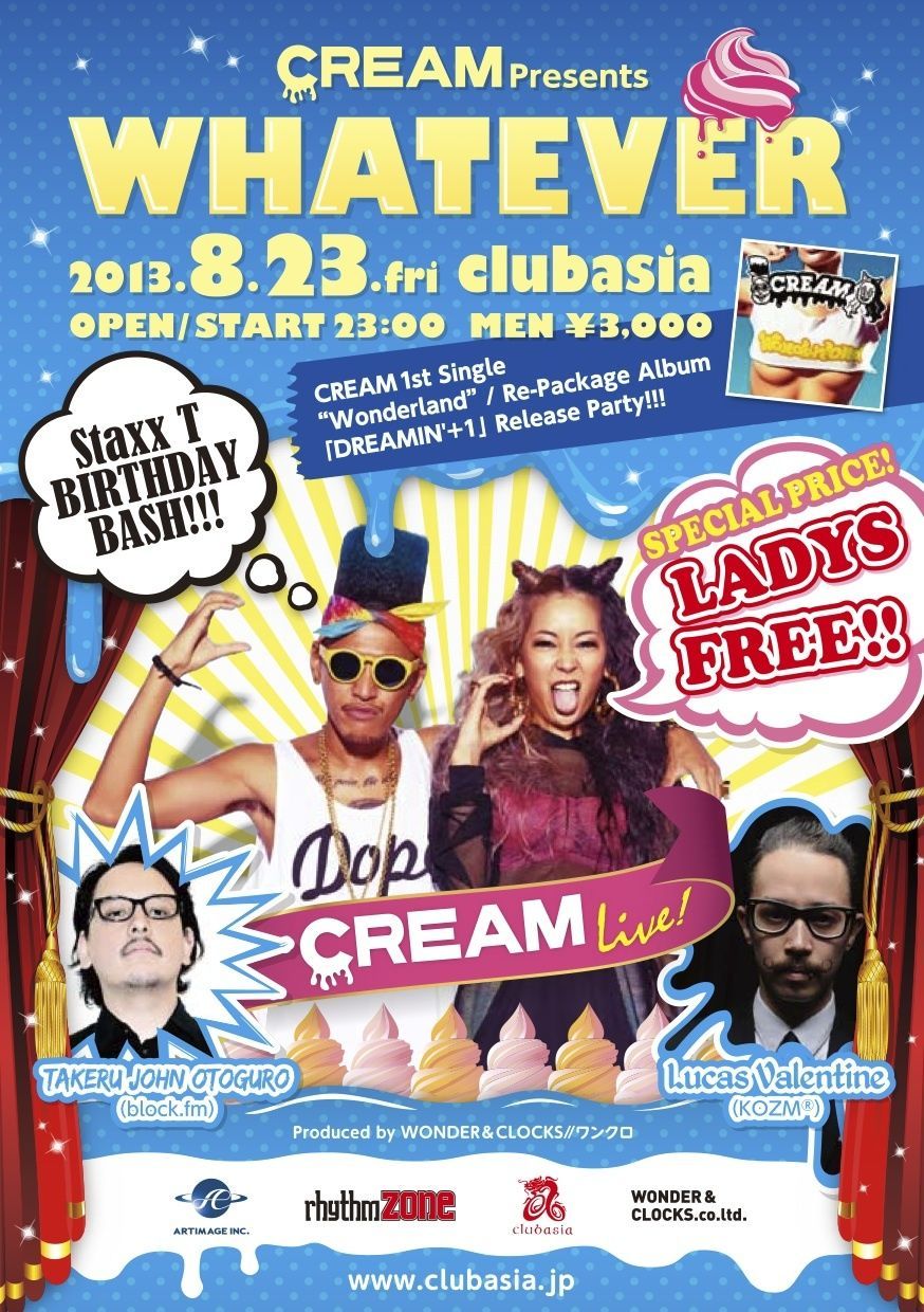 今年2月にメジャーデビュー・アルバム「DREAMIN'」を発表し、急速に知名度を増しているMinamiとStaxx Tによるユニット、CREAM。彼らの新たなイベント『WHATEVER』の第二弾が開催される。この日は、メジャー・ファーストシングル“Wonderland”と「DREAMIN'」をリパッケージしたアルバム「DREAMIN'+1」を今夏リリースしたCREAMが、それらの楽曲を交えたスペシャルライヴを披露。さらに、Staxx Tのバースデイを記念し、ハッピーモード全開の祝砲を打ち上げる。もちろん、CREAMの楽曲も手掛けるLucas Valentine、block.fmでもおなじみの実力派DJ:Takeru John Otoguroも出演。CREAMとその仲間たちが、最高にエキサイティングな時間をプレゼントする!