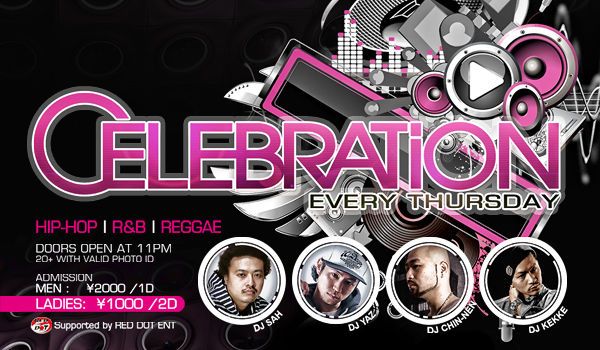 木曜日のVILLAGEは、週末とはひと味違うパーティー“CELEBRATION”。 渋谷で圧倒的な支持率を誇るDJ SAHを筆頭に、本場NYでそのスキルを評価され帰国後も活躍を続けるDJ CHIN-NEN、これまで六本木から福生まで多種多様なクラブをロックしてきたDJ YAZ。 この3名に、VILLAGE週末のレジデントに抜擢され注目度急上昇のDJ KEKKEを加え、贅沢なウィークデーパーティーをお届けします。 週替わりで登場するPOLE DANCERやGOGO DANCERと共に、華やかな熱気に包まれるフロアをお楽しみください