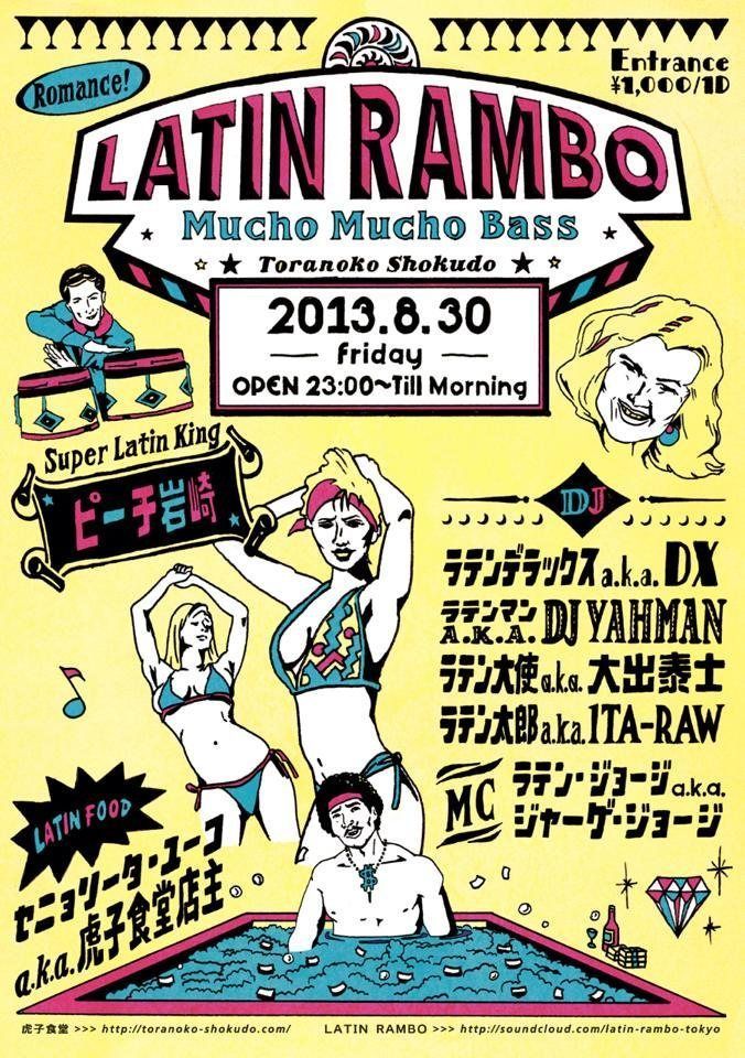 昨年の夏の終わり頃、毎週火曜に西麻布elevenで行われていたBig Bass Party「S.D.M」の一夜限りの番外編でもあったラテン・パーティがこの夏「Latin Rambo」と生まれ変わり、夏季限定のパーティとして帰ってくる!しかも昼ラテン、夜ラテンとして2ヶ月連続開催決定!Day 1は7月21日(日)の18:00から終電まで、Day 2は8月30日(金)の23:00から朝までラテン・ベース尽くし!普段はレゲエ〜Dub, Jungle, Drum'N'BassのマスターDJ's + MC + はたまた名物店主までがこのパーティのためにすべてをラテン・モードに変身!彼らが創造(妄想)するラテン・グルーヴとは?また、当然ラテン・パーティと打つからには"リアル"なラテン・プレイヤーが不可欠!と、最高にラテンなゲストに"コロリダス"とCopa Salvoのスーパー・ラテン・キング"ピーチ岩崎"氏を召還!この夏の始まりと終わりはラテン・ランボーがアミーゴするっ!