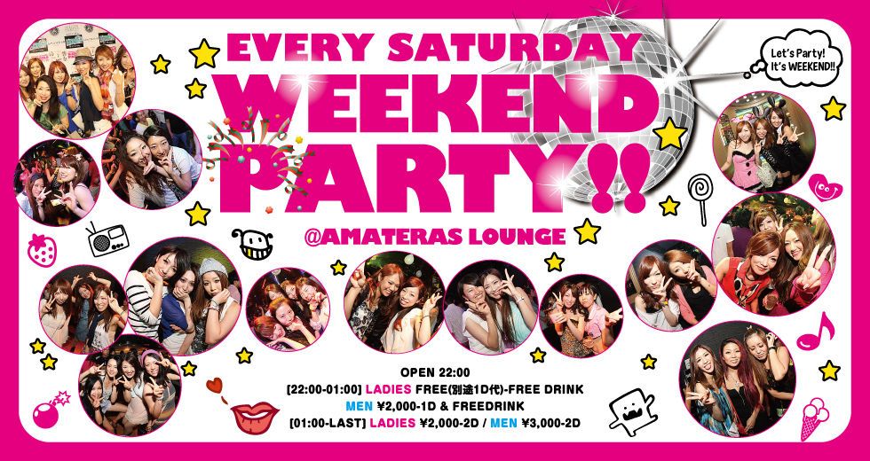 2013.11 23 SAT WEEKEND PARTY!! ALLMIX Facebook Twitter DATE: 2013-11-23 SAT OPEN: 22:00 VENUE: AMATERAS LOUNGE PRICE: LINE UP: Facebook Twitter