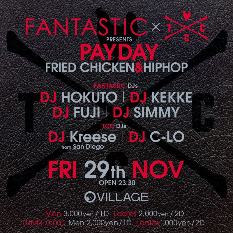2013.11 29 FRI FANTASTIC × TOKYO CHICKEN CONGRESS presents PAYDAY REGGAE HIPHOP R&B Facebook Twitter DATE: 2013-11-29 FRI OPEN: 22:00 VENUE: PRICE: Men ¥3000/1D Ladies ¥2000/2D LINE UP: FANTASTIC DJ HOKUTO KEKKE FU-JI SIMMY TCC DJ Kreese from San Diego C-Lo Facebook Twitter