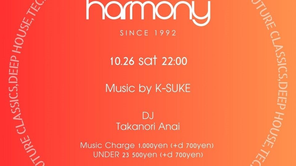 In October, HARMONY will be a long-awaited duo of K-SUKE and Takanori Anai. We hope you will enjoy the musical perspective of one DJ at a time.