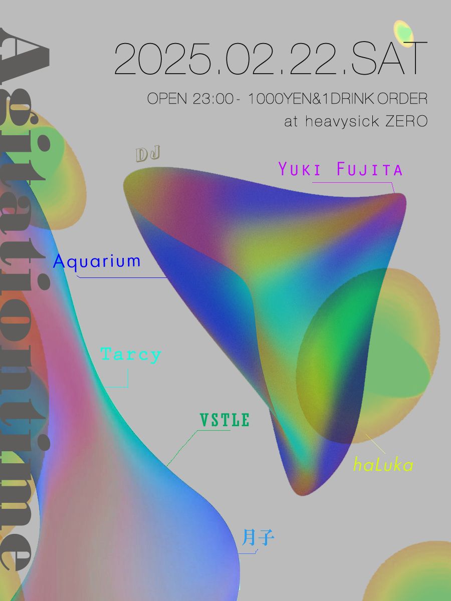 2025.02 22 SAT Agitation time HOUSE BREAKBEATS Experimental CROSSOVER Facebook Twitter DATE: 2025-02-22 SAT OPEN: 23:00 VENUE: heavy sick ZERO PRICE: DOOR:100YEN+1 drink order LINE UP: ■DJ Aquarium a.k.a. 外神田deepspace Yuki Fujita VSTLE Tarcy haLuka 月子 □heavysick ZERO Instagram https://www.instagram.com/heavysickzero/ Facebook Twitter