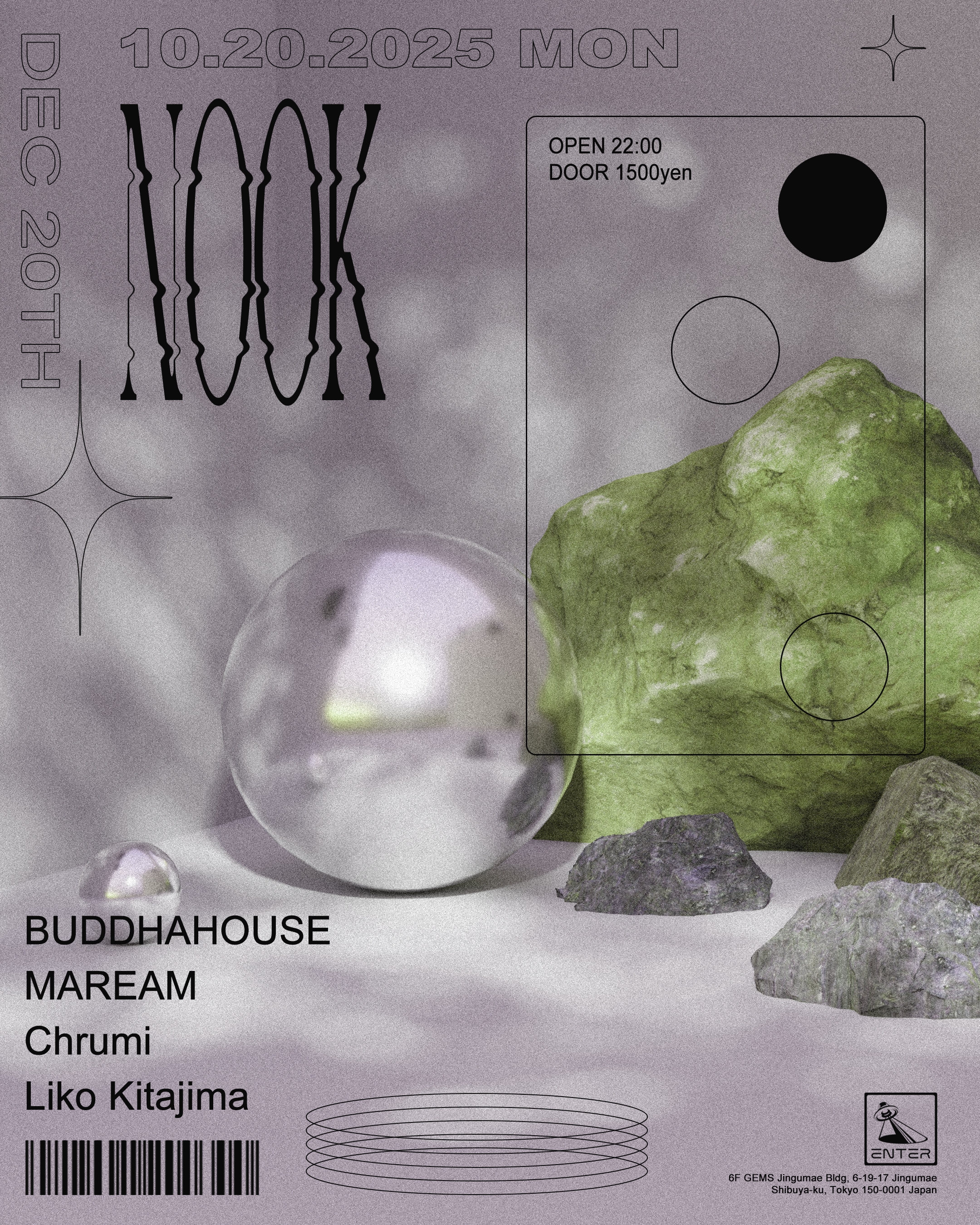TECHNO INVADERSのレジデントLiko KitajimaがオーガナイズするNook。〈FRUIT PARLOR〉主宰BUDDHAHOUSE、共に〈SPECTRA〉から楽曲をリリースしているプロデューサー、MAREAMとChrumiを招いて、フロアを深い音楽の渦に巻き込む