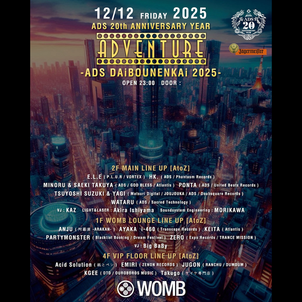 2025.12 12 FRI ADVENTURE -ADS 20TH ANNIVERSARY YEAR, ADS DAIBOUNENKAI 2025- TRANCE Facebook Twitter DATE: 2025-12-12 FRI OPEN: 23:00 VENUE: WOMB PRICE: DOOR: TBA ‖ADVANCE TICKETS: TBA LINE UP: 2F MAIN FLOOR E.L.E (P.L.U.R/VORTEX), HK. (ADS/PHANTASM RECORDS), MINORU & SAEKI TAKUYA (ADS/GOD BLESS/ATLANTIS), PONTA (ADS/UNITED BEATS RECORDS), TSUYOSHI SUZUKI & YAGI (MATSURI DIGITAL/JOUJOUKA/ADS/DOUBSQUARE RECORDS), WATARU (ADS/SACRED TECHNOLOGY) VJ: KAZ LIGHT & LASER: AKIRA ISHIYAMA SOUNDSYSTEM ENGINEERING: MORIKAWA 1F WOMB LOUNGE ANJU(阿羅漢-ARAKAN-) AYAKA, 1-460 (TRANSCAPE RECORDS), KEITA (ATLANTIS), PARTYMONSTER (BLACKLIST BOOKING/DREAM FESTIVAL), ZERO (EXPO RECORDS/TRANCE MISSION) VJ: BIG BABY 4F VIP FLOOR ACID SOLUTION (紙とペン) EMIRI (ZENON RECORDS), JUGON (RANCHU/DUMDUM), KGEE (DTD/OUROBOROS MUSIC), TAKUGO (サイケ専門店) いよいよ12/12(金)は毎年恒例のこの時期がやってきました、=ADVENTURE= ADS DAiBOUNENKAi 2025 開催決定! . 毎年恒例の超満員大盛況の ADS 大忘年会を、今年は、ADS 20th ANNIVERSARY YEAR =ADVENTURE=の千秋楽として WOMB にて開催。 Facebook Twitter