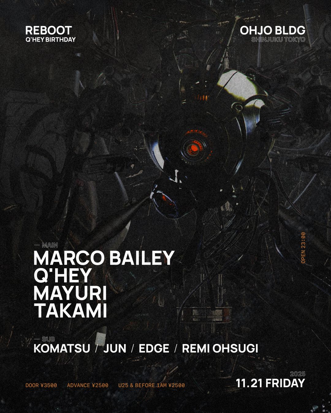 今年、27周年パーティーを期間限定ベニュー「ZERO-SITE Takanawa Gateway」で成功させ、新旧のManiac Loversを沸かせたREBOOTが、盟友Marco Baileyを迎えて新宿のアンダーグラウンドな新ベニュー「王城ビル」で初開催。さらにこの日は、11月に誕生日を迎えるQ'HEYのBIRTHDAY PARTYとしても特別な一夜となる。