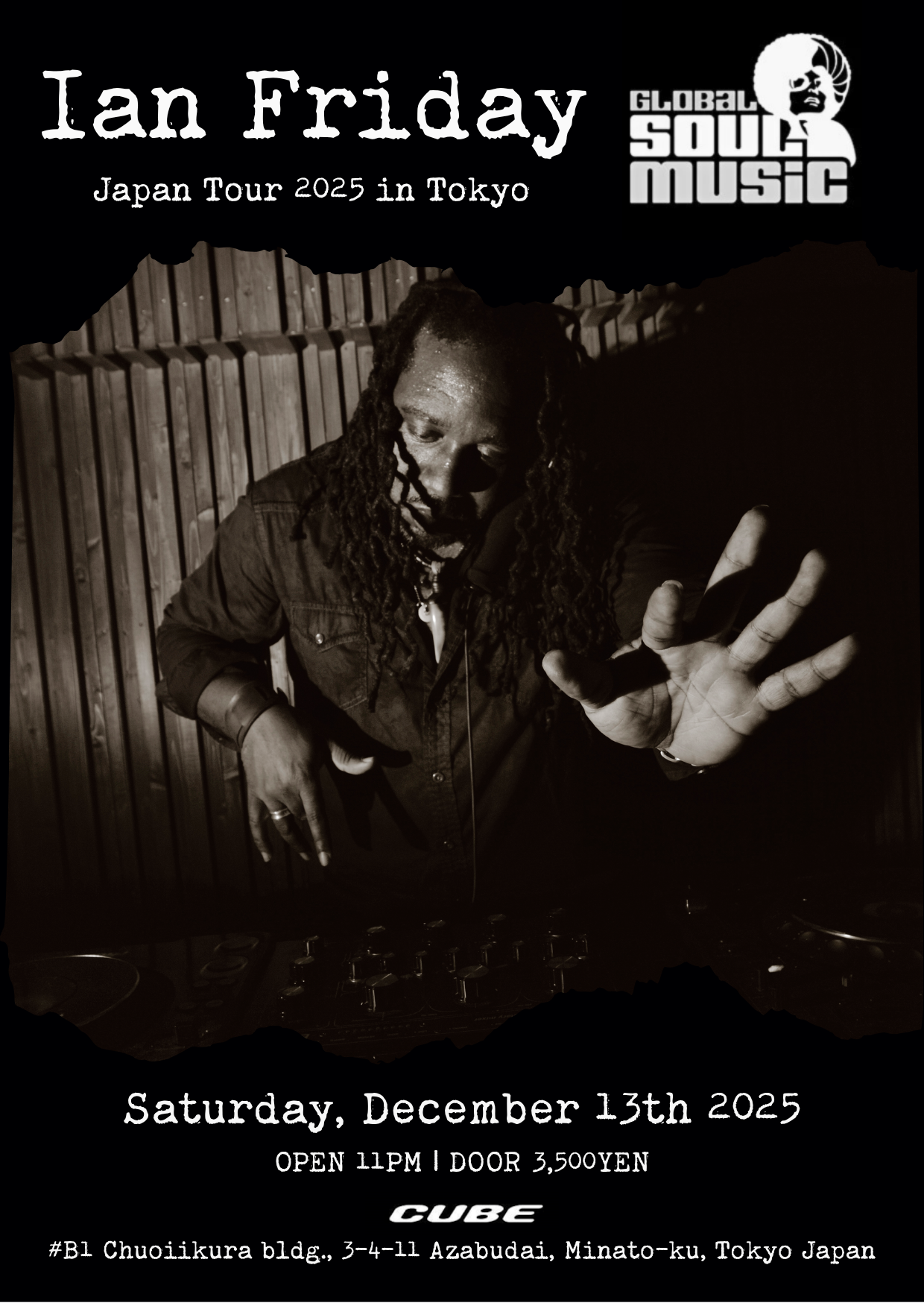日本にも数多くのファンを持つブルックリンレジェンドの1人Ian Fridayが、およそ10年振りとなる待望のJapanツアーを開催!東京公演の会場は、長年に渡りカルチャー発信基地として進化し続けているCUBE。 そして、関東圏を中心に活動する実力派のDJ・ダンサー達も参加し、10年振りの公演を盛り上げる。 ブラックネス溢れる本物のグルーヴを体感出来る貴重な一夜。ぜひフロアで体感してほしい。