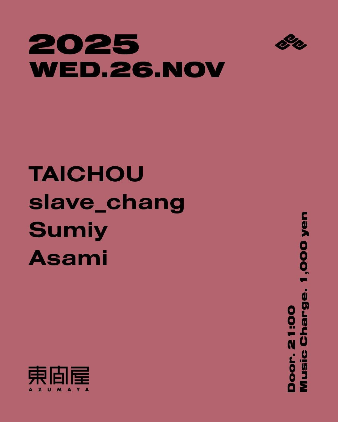 2025.11 26 WED Azumaya -Wednesday- iFLYER: 357918 HOUSE Facebook Twitter DATE: 2025-11-26 WED OPEN: 21:00 VENUE: AZUMAYA PRICE: Music Charge 1,000yen LINE UP: TAICHOU slave_chang Sumiy Asami Facebook Twitter