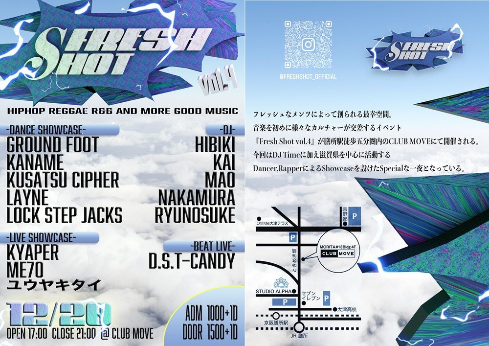 フレッシュなメンツによって創られる最幸空間。音楽を初めに様々なカルチャーが交差するイベント『Fresh Shot vol.4』が膳所駅徒歩五分圏内のCLUB MOVEにて開催される。今回はDJ Timeに加え滋賀県を中心に活動するDancer,Rapper,Beat MakerによるLive Showcaseを設けたSpecialな一夜となっている。