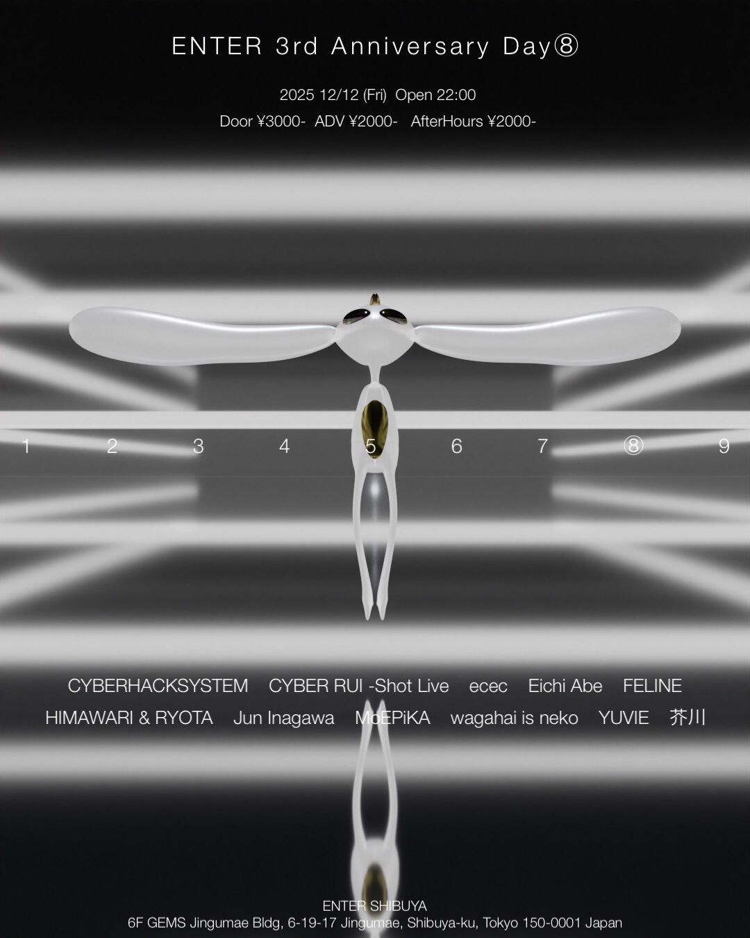 2022年12月15日にオープンしたENTER SHIBUYA。この度、3周年を祝した2週間に及ぶ9日間のアニバーサリーパーティを開催する。記念すべきDAY8はファッション/カルチャー/音楽の交差点で活躍する面々が揃った。